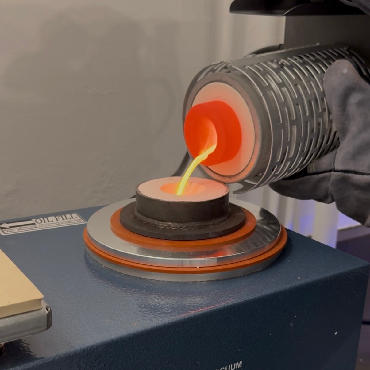 The plaster mold is placed in a kiln that heats to over 1,300 degrees in order to burn the wax out, leaving a negative space. Molten gold over 1,800 degrees is then poured into the mold, a process that takes less than five seconds.