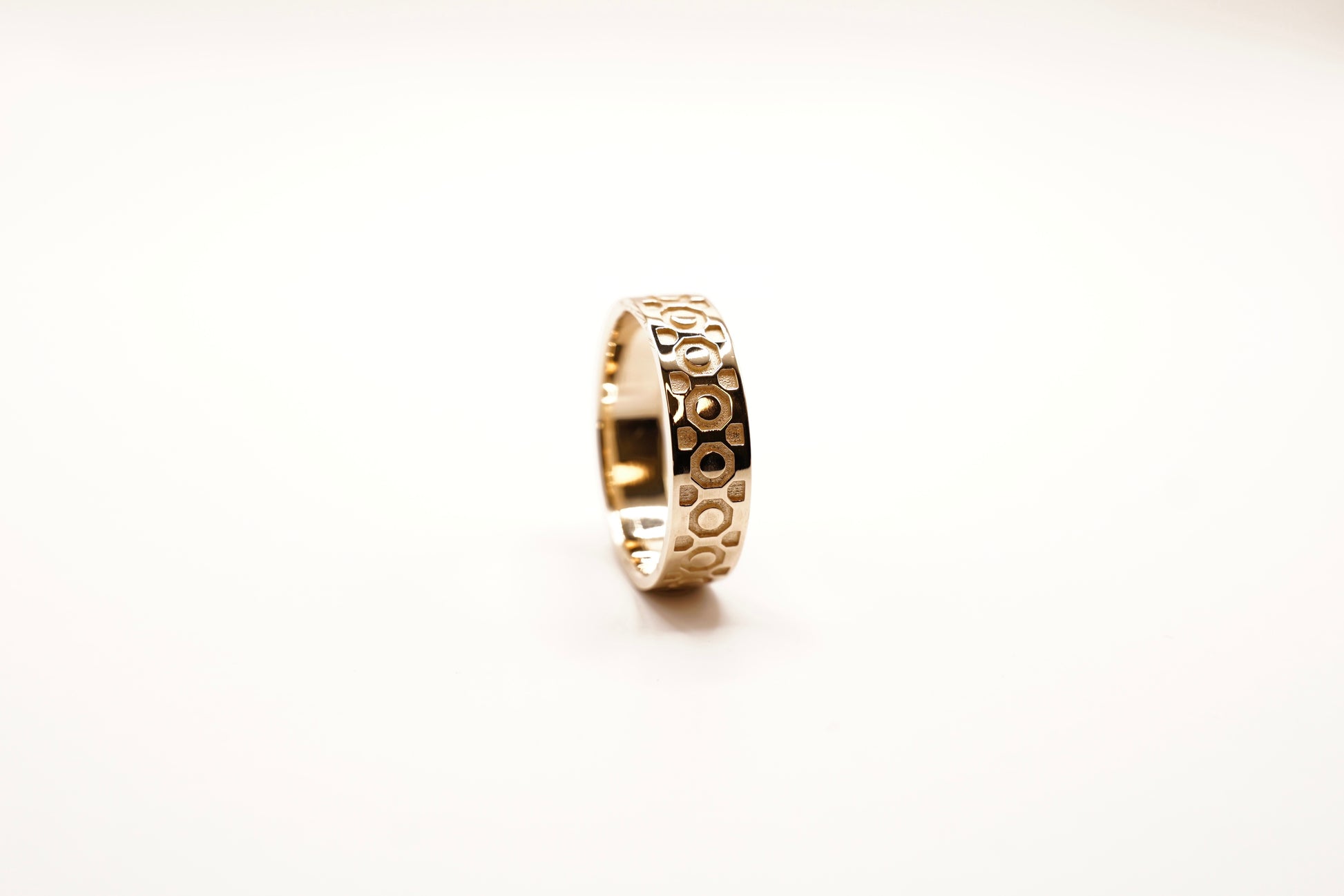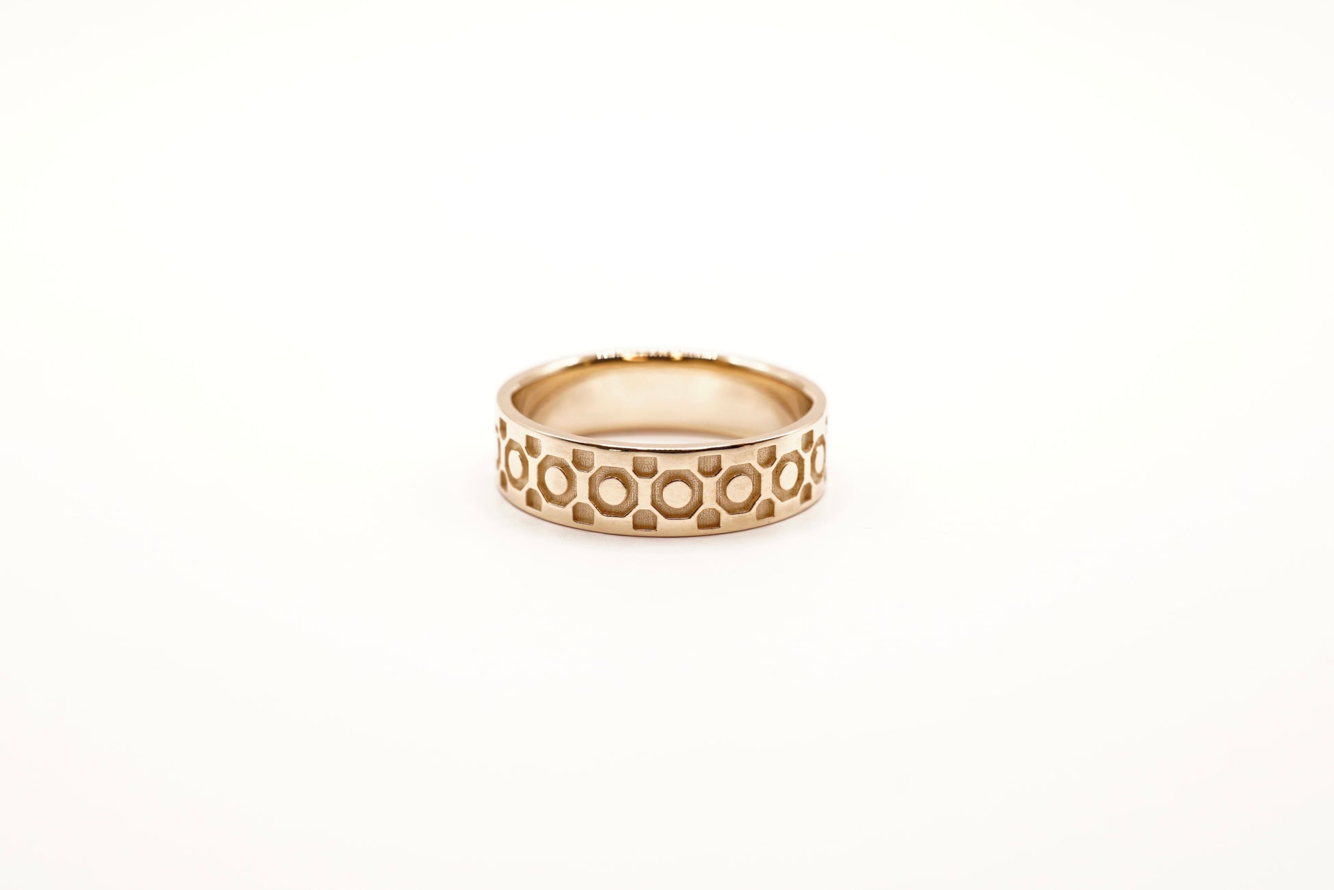 Cast in 14k solid gold this stunning ring is offered in yellow, white or rose gold colors, and offers a high polish surface that reveals great contrast from the recessed pattern. A simple and elegant pattern of geometric shapes and circles represents the classic era this ring is designed after.