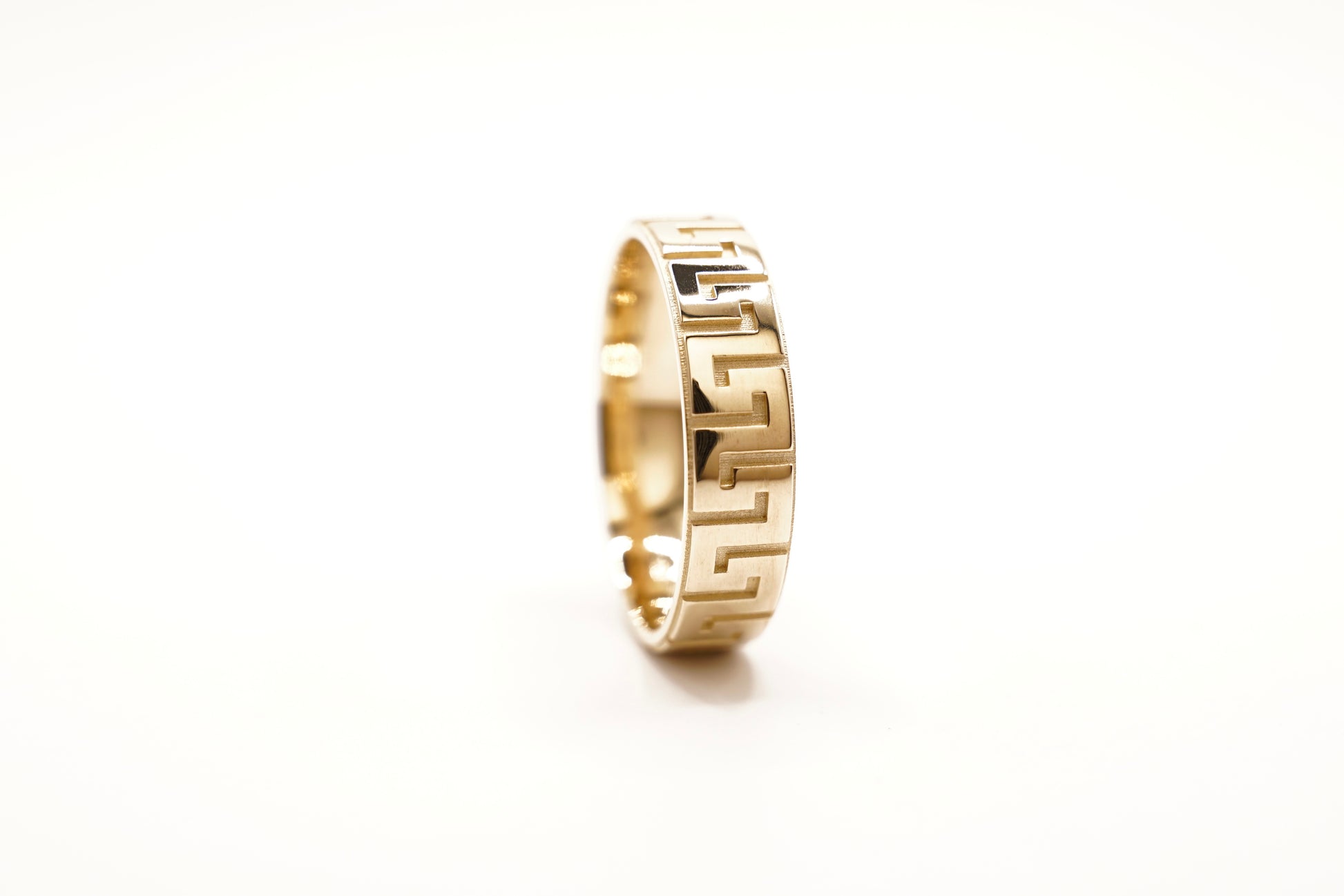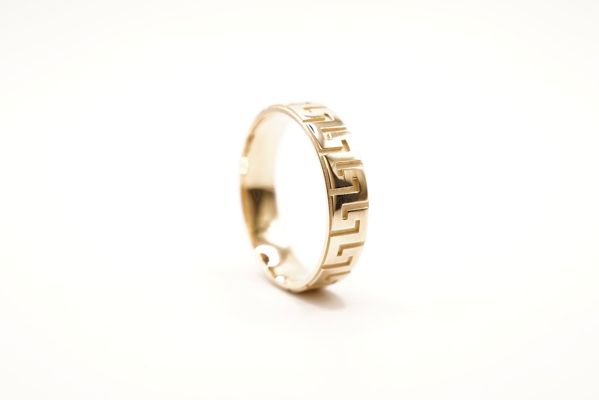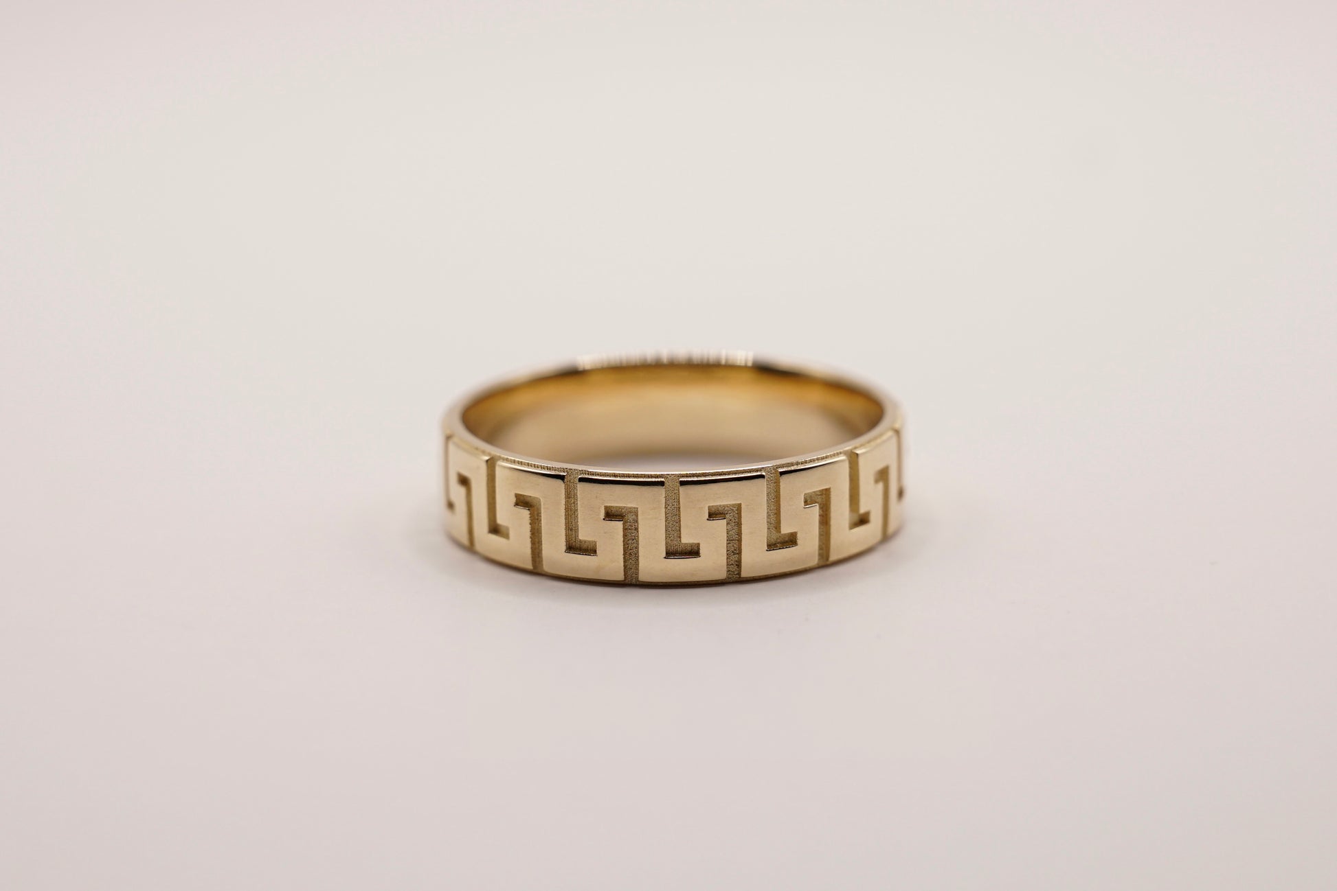 Cast in 14k solid gold this stunning ring is offered in yellow, white or rose gold colors, and offers a high polish surface that reveals great contrast from the recessed pattern. A simple and elegant pattern of geometric shapes and circles represents the classic era this ring is designed after.