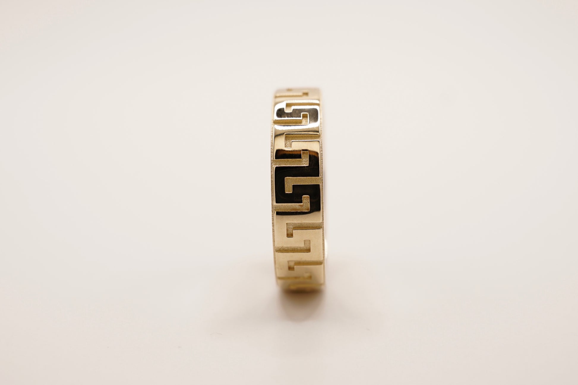 Inspired by a decorative boarder motif this ring is designed after a pattern of a continuous line that has been around for centuries. Once you see it you can't unsee it I encourage you to start looking for this pattern on the buildings across your city.
