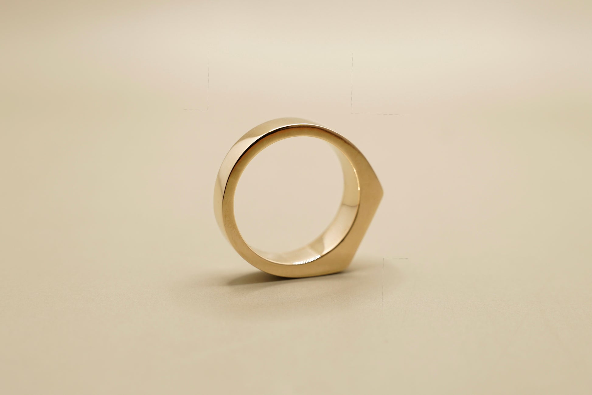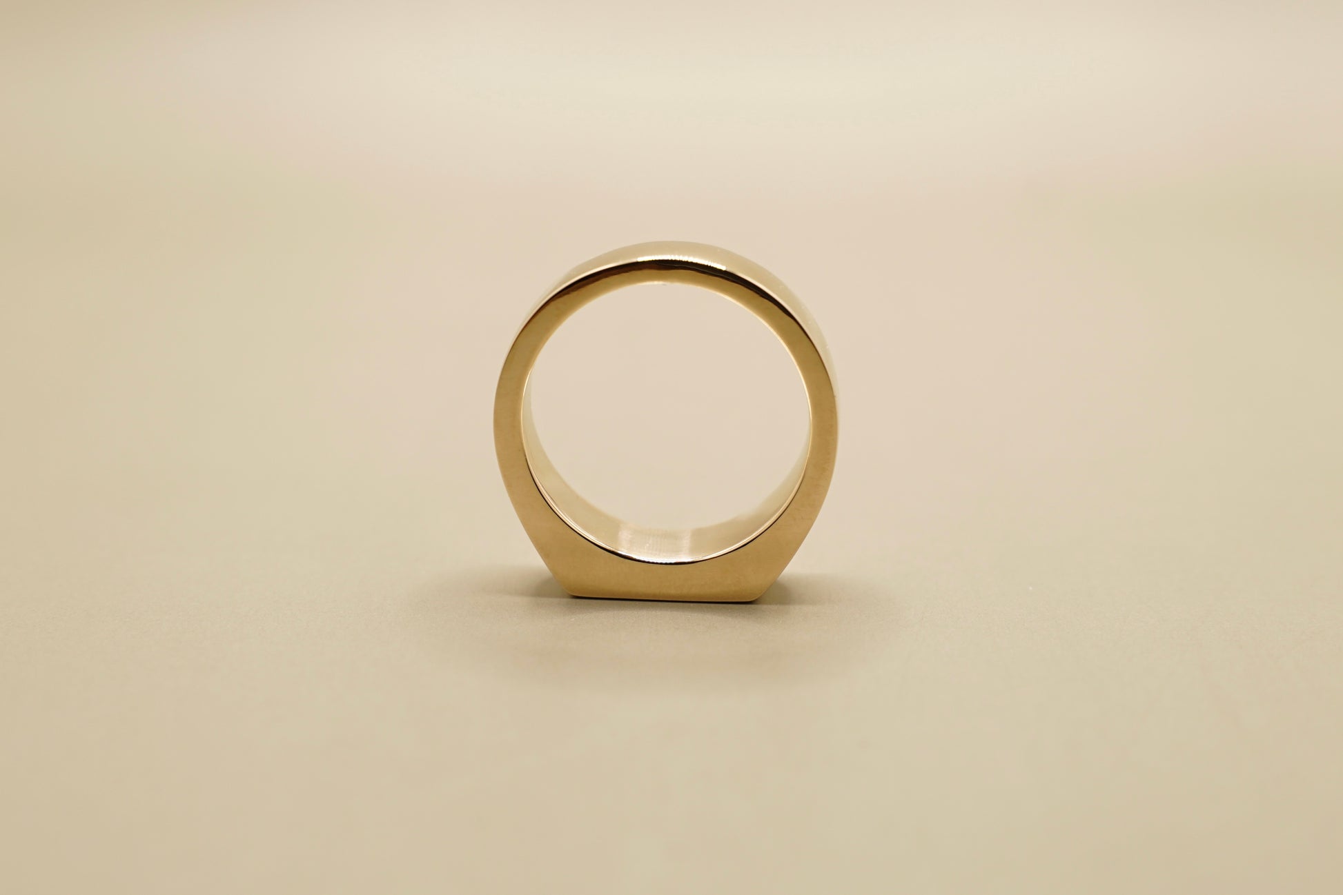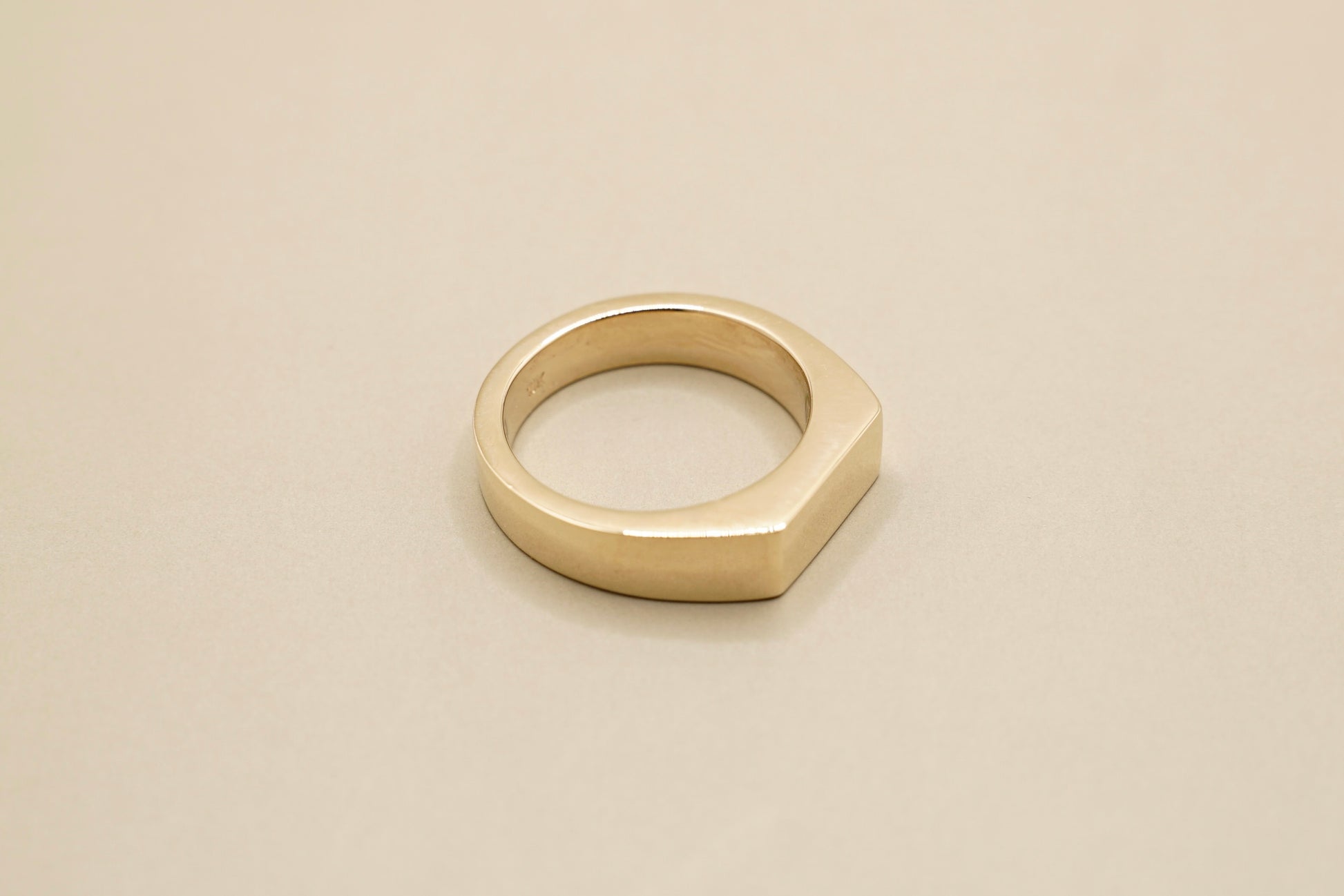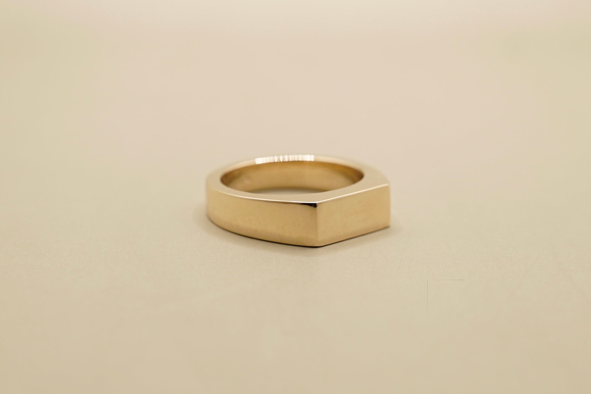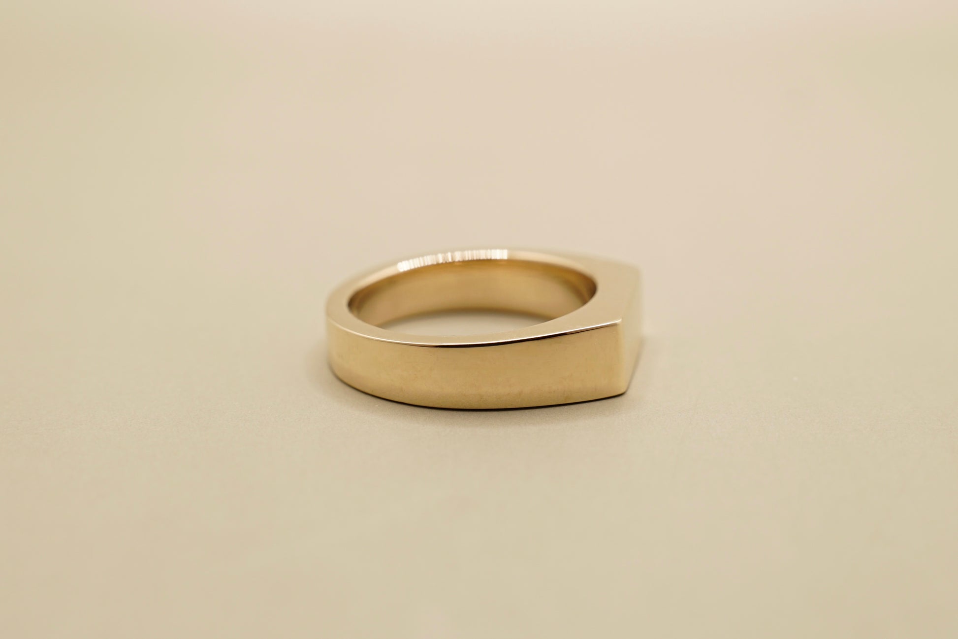 A modern shape that mixes the flat surface of a signet ring with the smaller profile of a band style ring. Handed carved to order and completely unique I ensure no matter what ring size you order the rectangular surface is perfectly proportional to your finger.